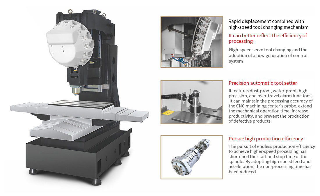 1、The unique large-span structure design of the base and columns is as solid as a rock and as stable as Mount Tai。 2、The direct-coupled high-speed spindle has a sensitive response and the tapping can reach6000rpm。 3、The three-axis rapid displacement is 48(60 meters), significantly reducing the processing time。 4、Raise the column design to reserve space for the installation of the 4th and 5th axes。 5、High-speed servo tool changing is fast and stable, reducing non-processing time。 6、The machine's chip removal adopts a rear row type, featuring the optimal chip removal Angle and a super-large flow chip flushing system。Product application
